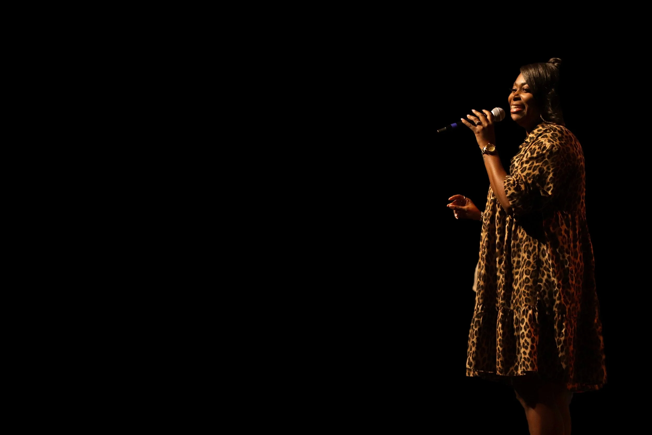 Photo taken of Jahana McCoy sing the Black National Anthem (Lift Every Voice and Sing) at 2024 Umoja Black Graduates Celebration